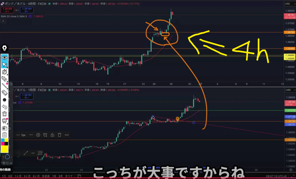 4h1h同時越え攻防ライン抜けでエントリーを狙う際にエントリーポイントが来ても、4h本当に波が出やすいか?4h微妙な感じではないか?が重要、下位足でエントリーポイントが来たからではなく4hが波が出やすいと判断した上でのエントリーポイントでないと、下位足を見るとどれもこれもエントリーポイントに見えてエントリーして負ける事になる!