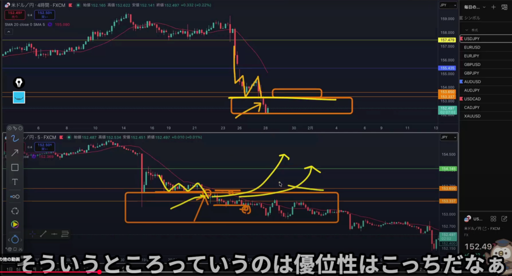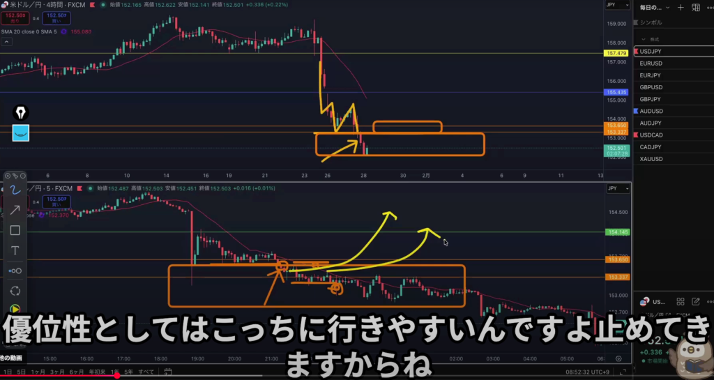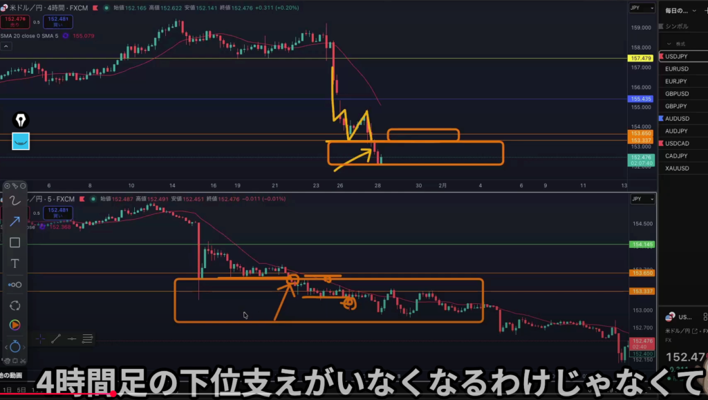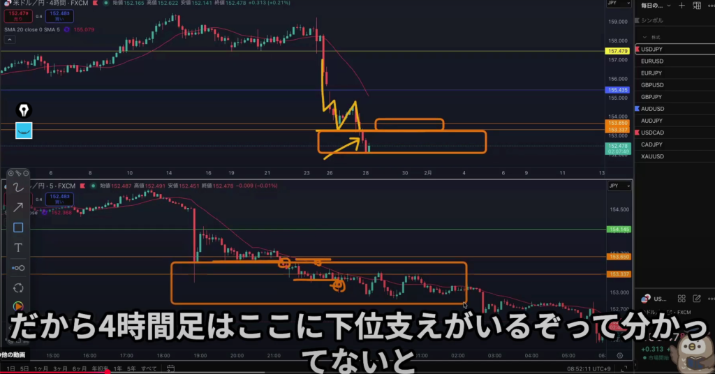 4h買い支えがいるところでの直感トレードは5mが抜けても4hの買い支えはいなくはならず優位性としては上方向、それでも直感的に下降すると思えばロットを下げたりして入ったりもする。
