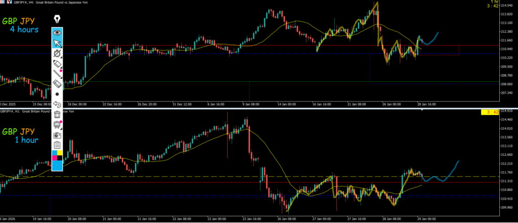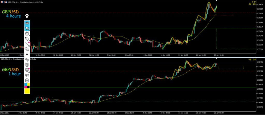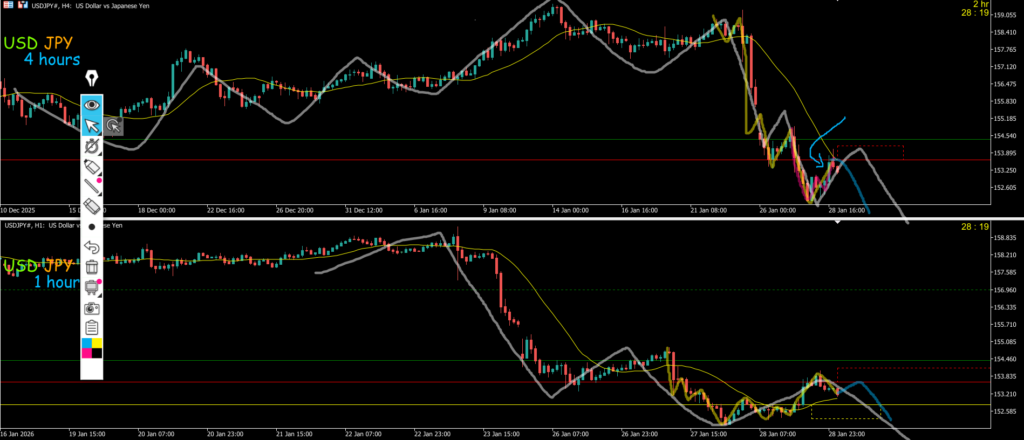 4h水平線に達しているがまだ止まったとは言えない1hが反転しそうだがレジスタンスラインとMAによって抑えられている、4hの波的には東京開場で波が出てもおかしくはないがユーロドルなのでスルー、もう一度戻されて欧州辺りで1h反転でのエントリーを考えていきたい