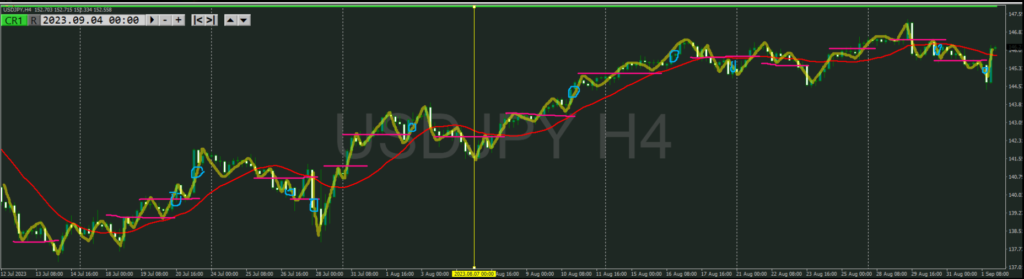・点線を抜けると上目線でトレンド転換シグナルになる