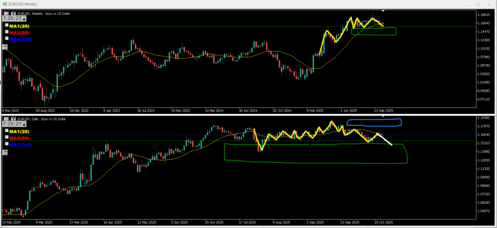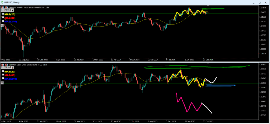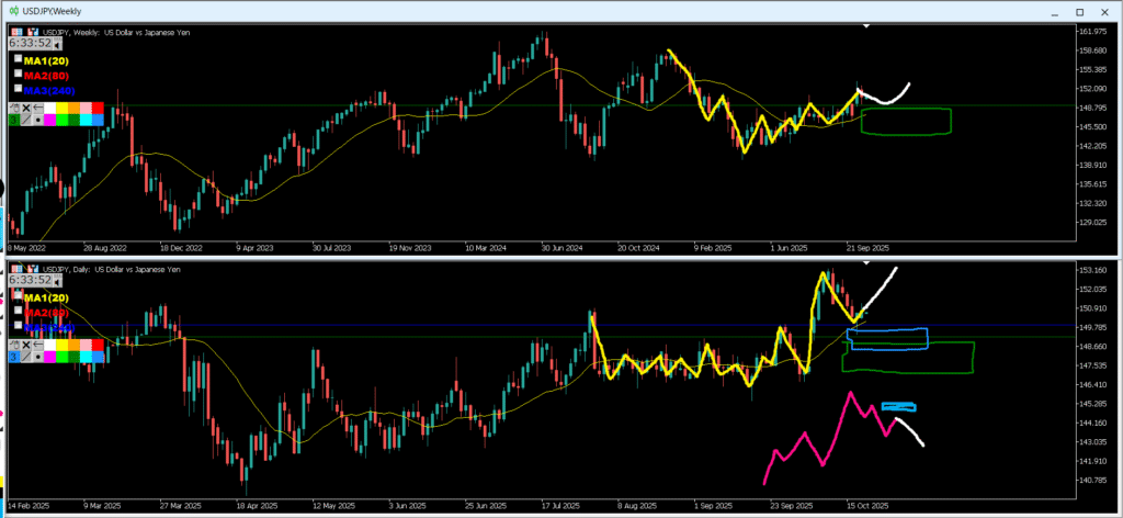 ・青ラインへ来ると止められやすく押し目買いになりやすいが、週足売り抑え日足押し目買いなので戦争状態になっている。