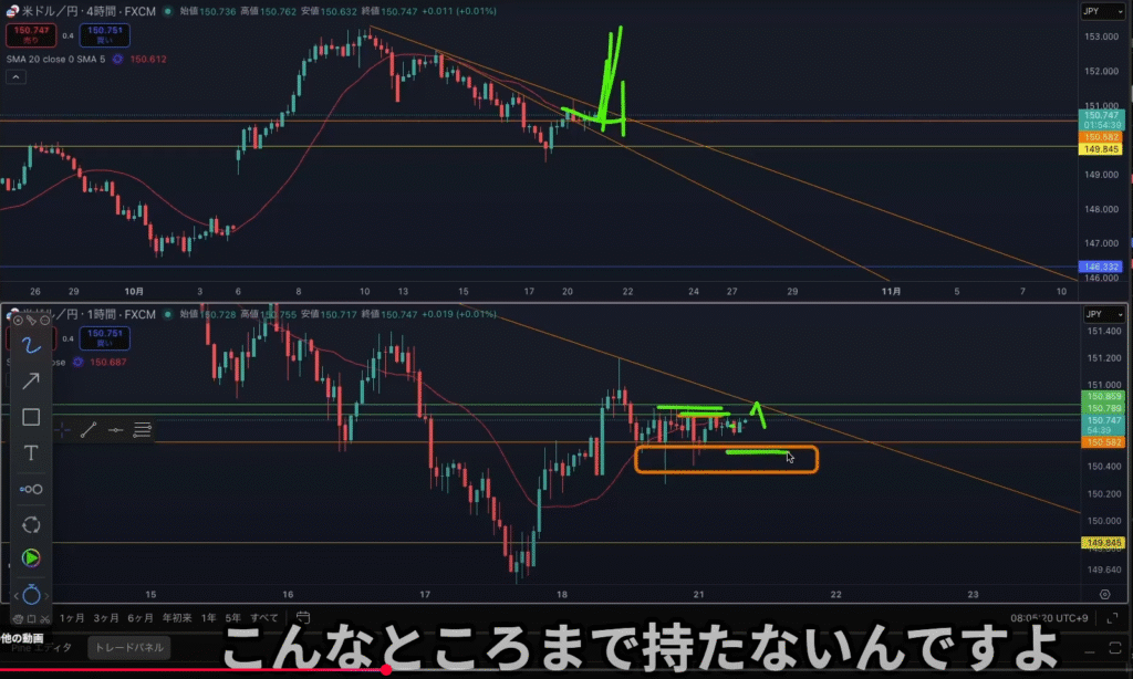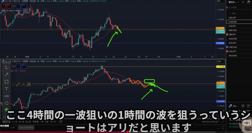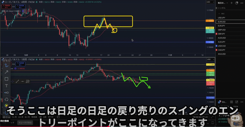 ・4hの戻り売りが入る場合1hレジスタンスラインを越えて4hレジスタンスラインまで上昇して行く可能性はある、そこから下降トレンドになったポイントがトレンド転換シグナルでありエントリーポイント。