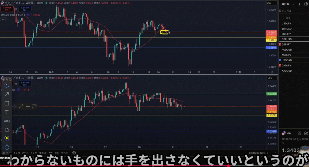 朝の環境認識では日足の押し目買いエリアで日足の時間経過を待っている状態なので4hヨコヨコになりやすいとしていたが、すでに4hでは時間経過が経っていたので間違っていたが全体的な流れは合っていた。