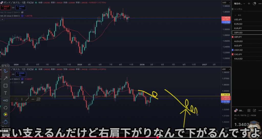 週足の買い支えが下にいるので静観した方が良いと思う反面、週足の買い支えラインまでは少し値幅があるのでそこまでは取りに行ける可能性があると両方で考えていたが、環境認識養成講座を観て塾長は下降を狙えてスイングのエントリーポイントとも言われていたので静観ではなく狙って行くところ!