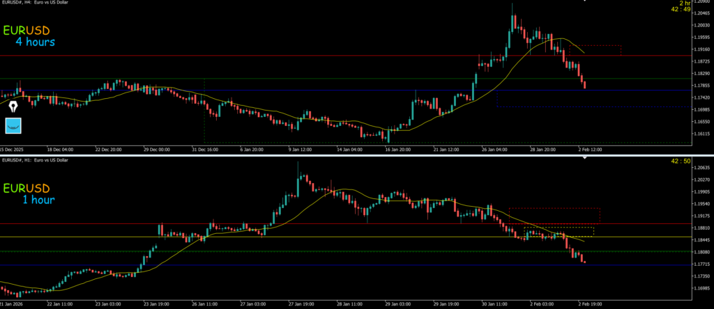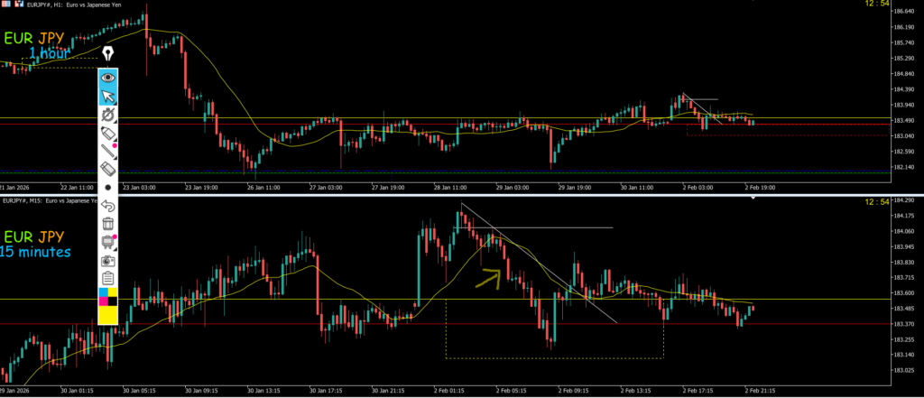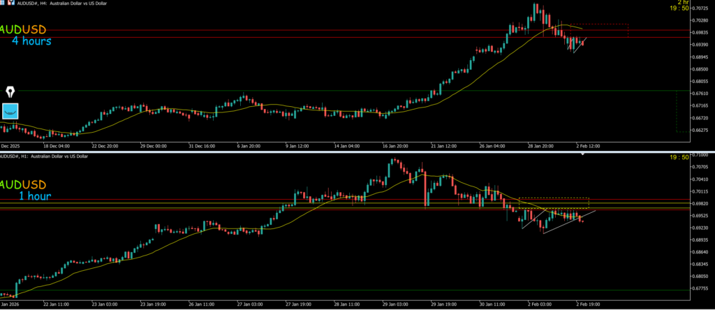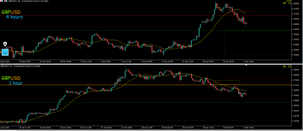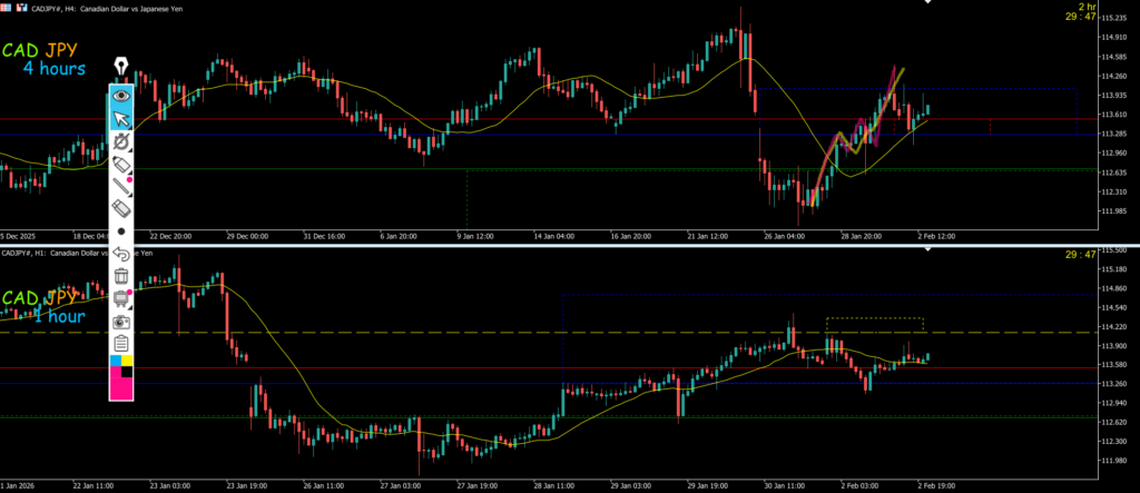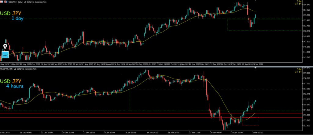 ・短期足では、移動平均線や直近の攻防を意識する。四時間足と一時間足が同時に重要な価格を割るかどうかで、次に待つポイントが明確になる