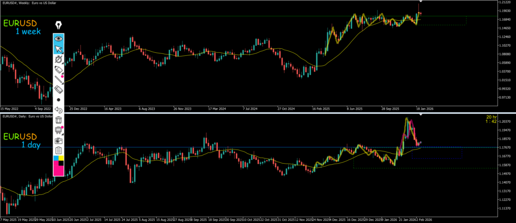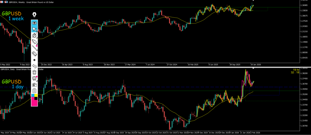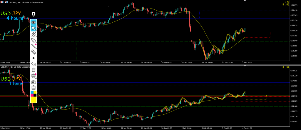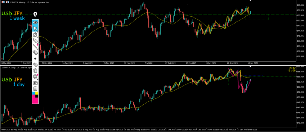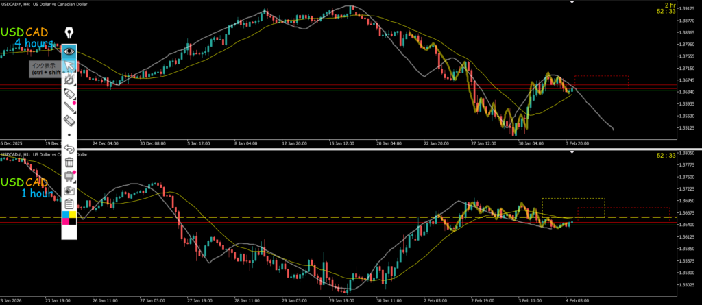4h小さく二番になり本来であればレジスタンスライン抜けがスイングトレードのエントリーポイントになるが日足は空中戦で存在確認が出来ていない、4hMAとレジスタンスライン抜けの反転から1h押し目買いになれば4h1波狙いのエントリーを考えていきたい