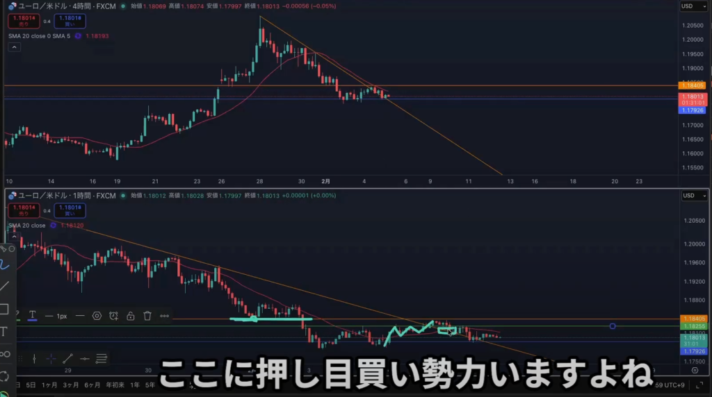 環境認識通り4h押し目買いの波はNYで上昇し始めたが1hMAによって抑えられている
