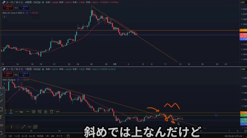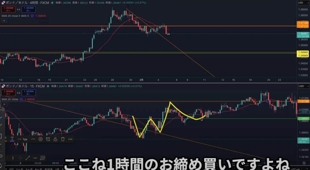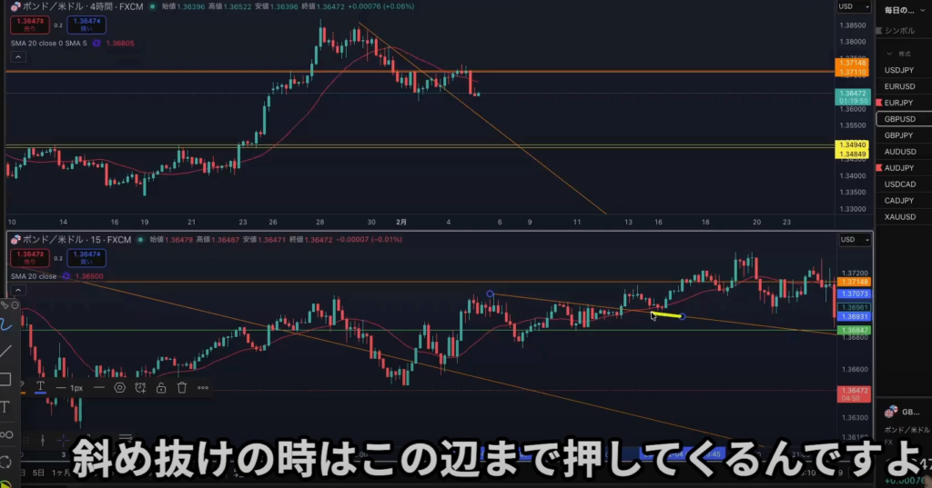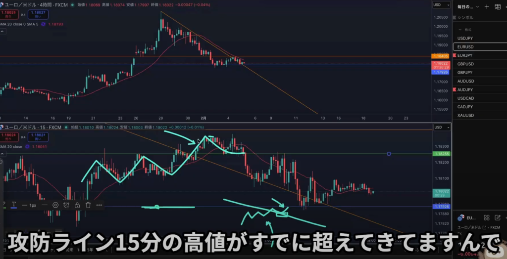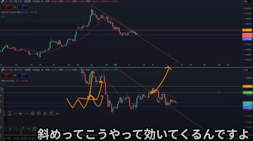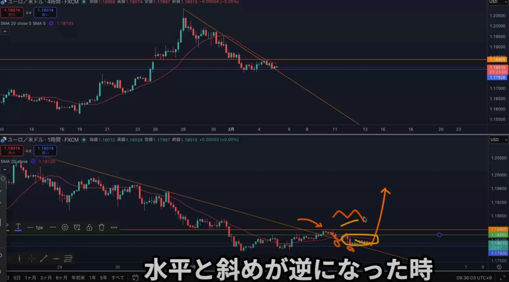 4hの斜め抜け4h1波を狙うトレードは1h押し目買いで15mも同時高値越えしている場合は攻防ライン抜けでエントリー、4hレジスタンスライン抜けを試す事になる