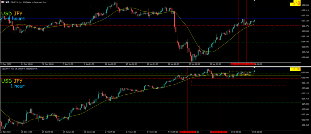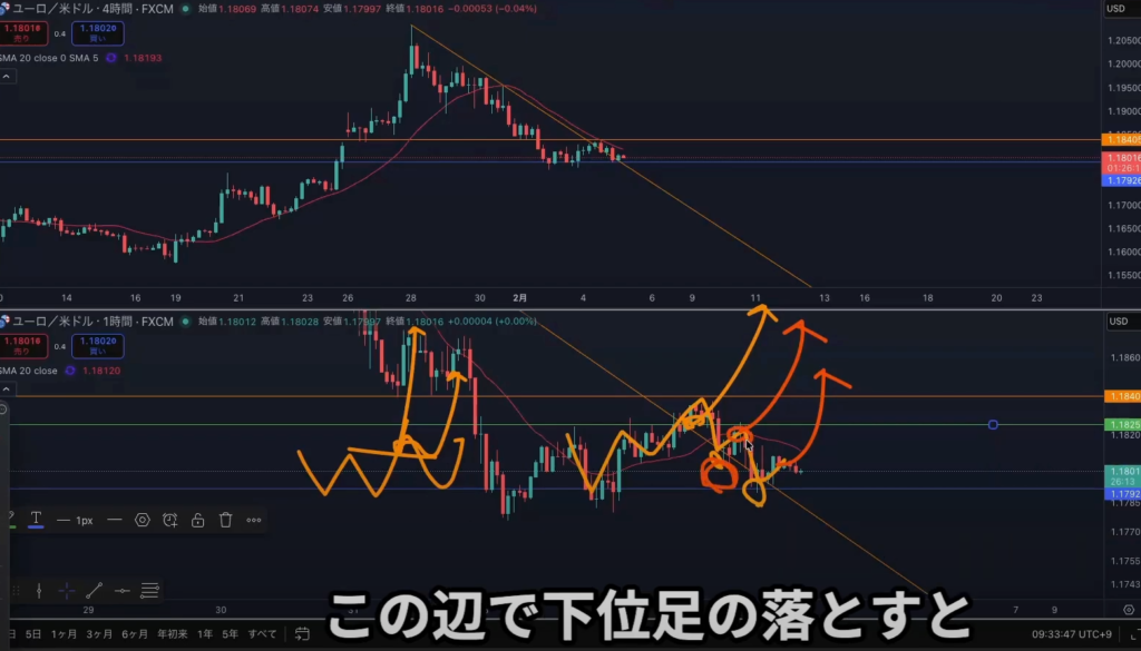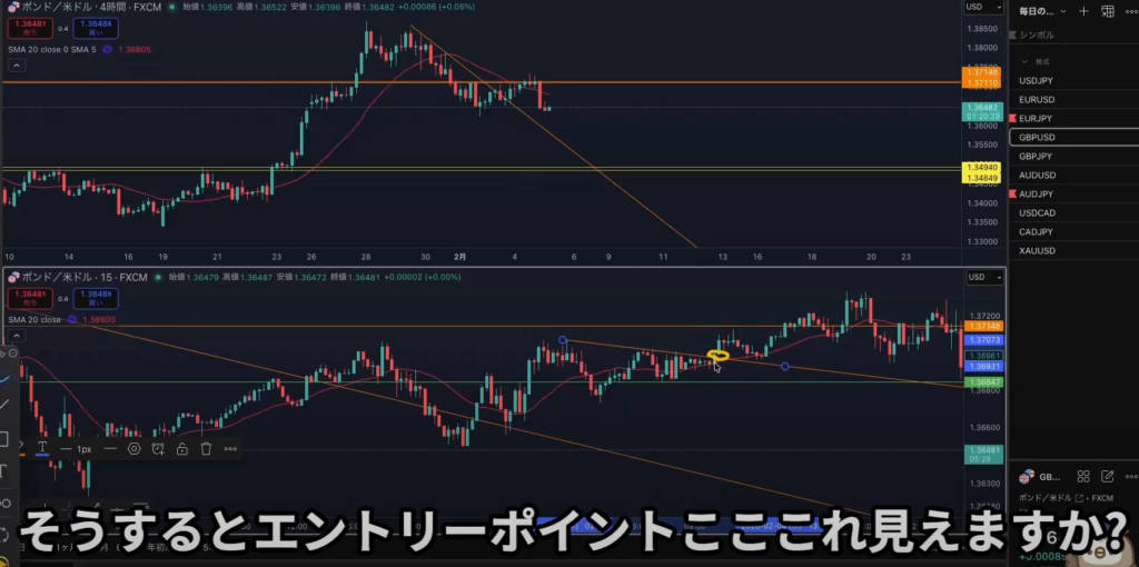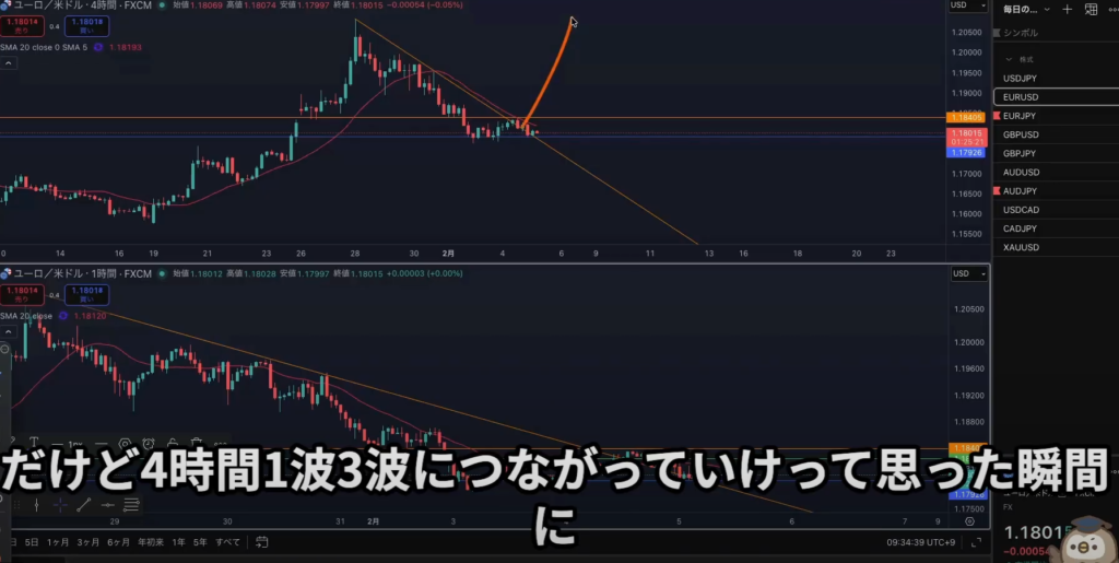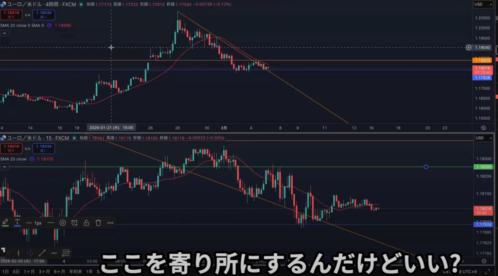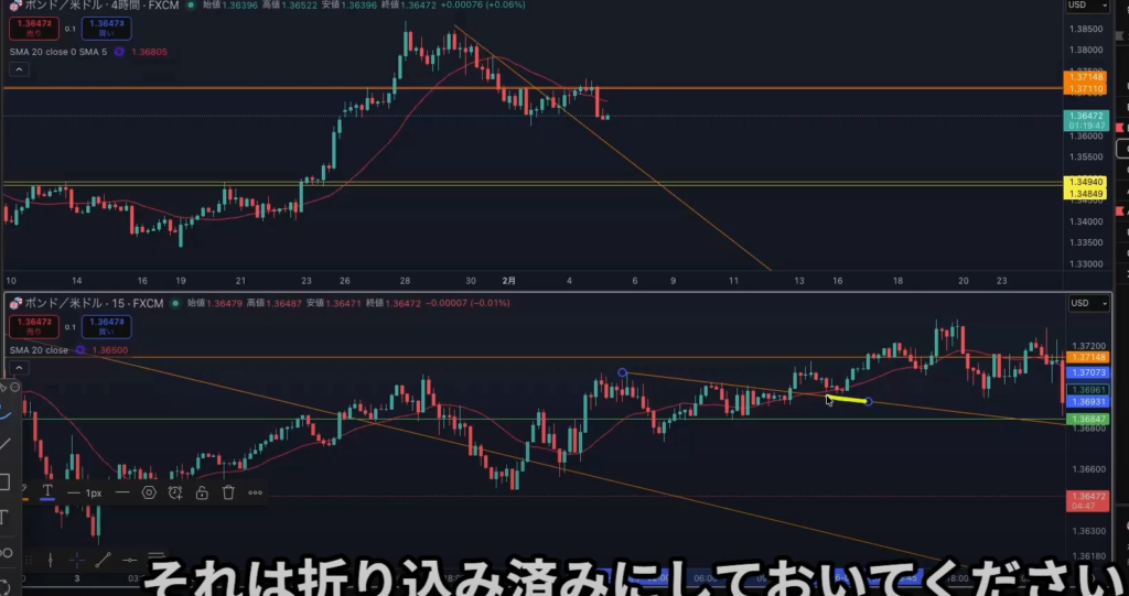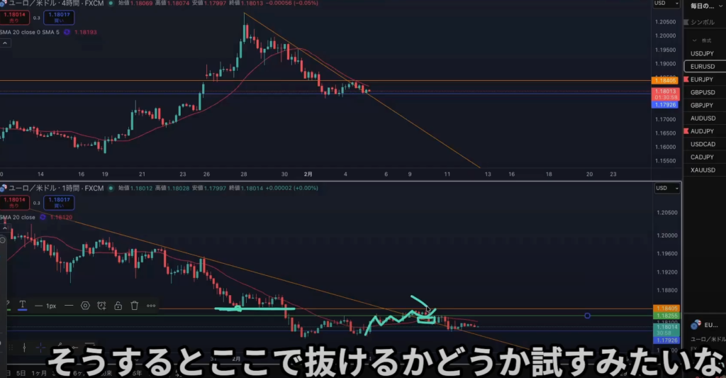 4hの斜め抜け4h1波を狙うトレードは1h押し目買いで15mも同時高値越えしている場合は攻防ライン抜けでエントリー、4hレジスタンスライン抜けを試す事になる
