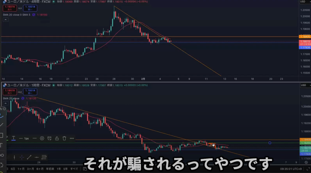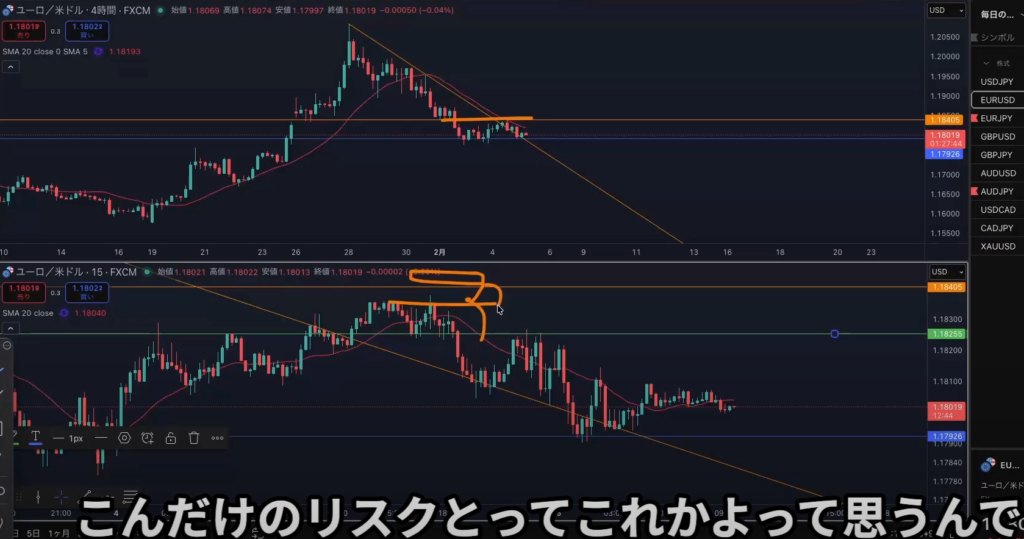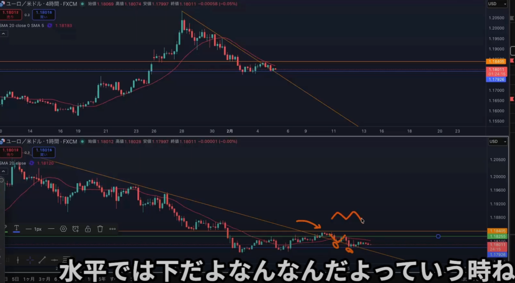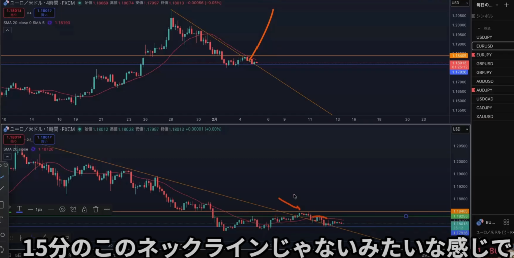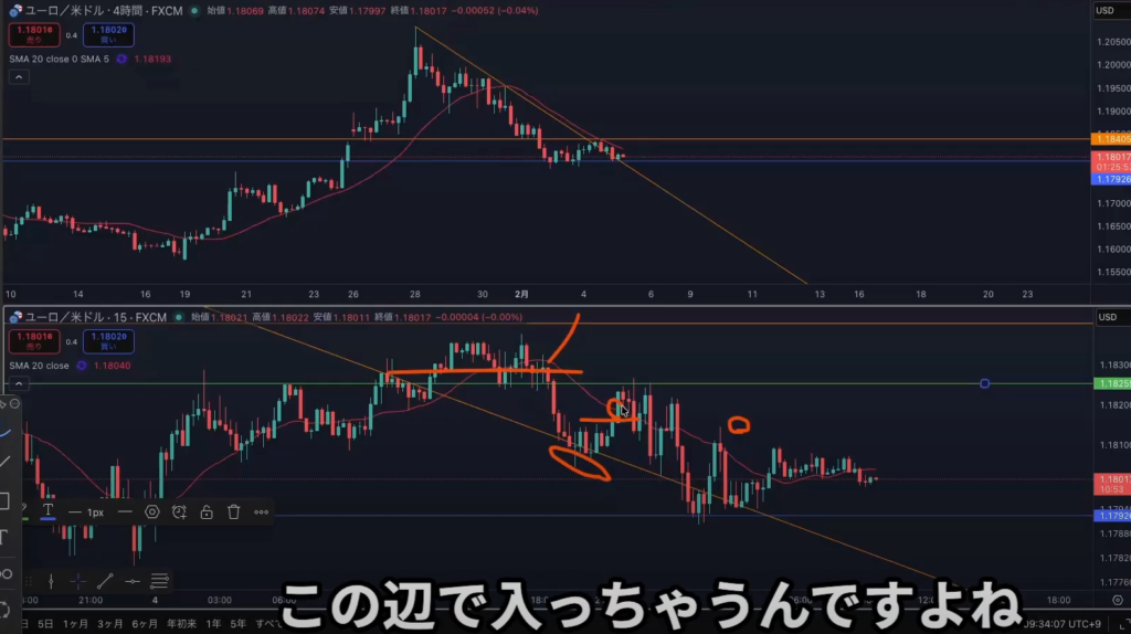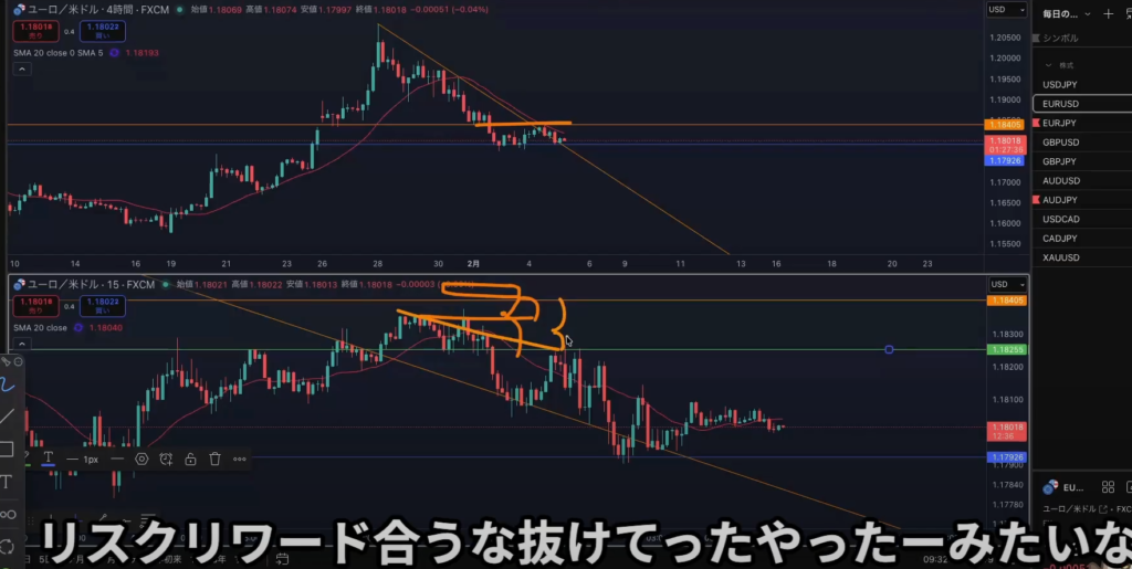 ただ斜めでレジサポして効いたからといって1hをないがしろにして15mに落としてネックライン抜けでエントリーすると1hは下なのでMAなどによって落とされる事があるこれが騙されるというやつ