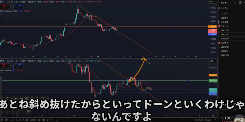 4h斜めを抜けても一気に伸びる訳ではない斜めに対してレジサポしてから伸びて行く事もある