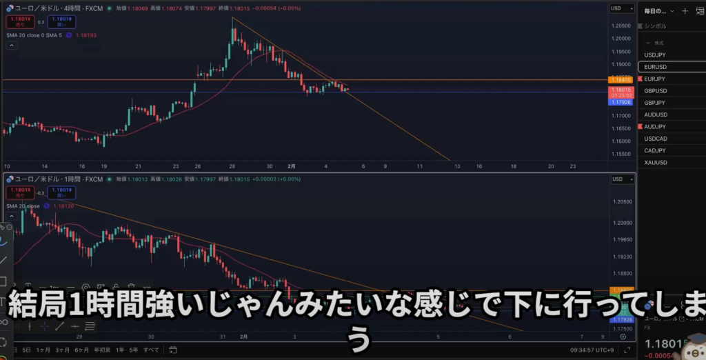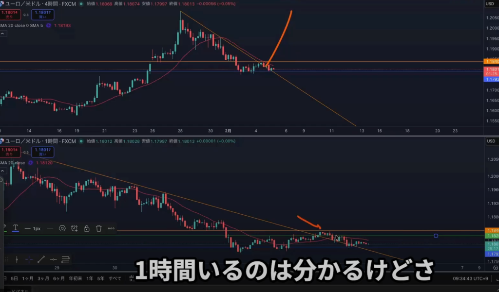 10時に確認したら1hMAとレジスタンスラインに抑えられている