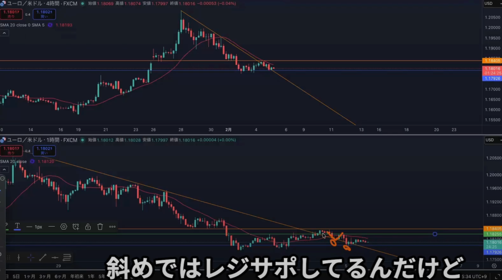 斜めはレジサポして効いているけど水平では目線が変わって来ている時はゴチャゴチャしやすくストレスの掛かるトレードになりやすい事を頭に入れておく