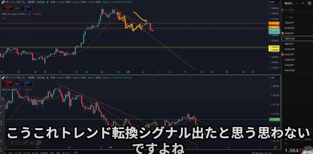 ・点線を抜けると下目線でトレンド転換シグナルになる