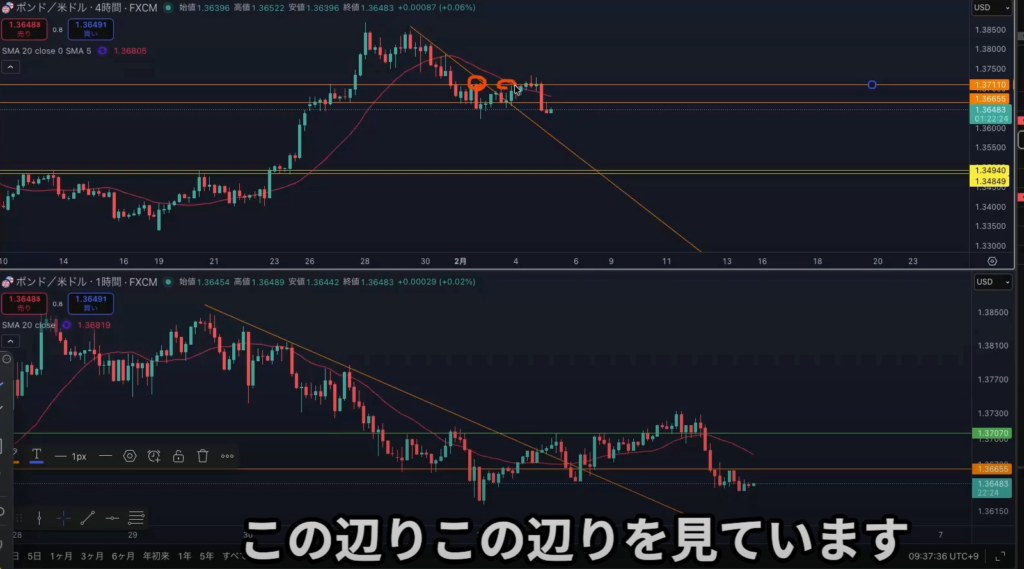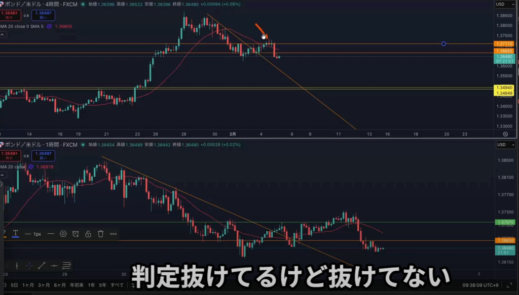 環境認識通り日足サポートラインと4hレジスタンスラインに挟まれ尚且つ日足MAは支えてきていて4hMAは抑えてきているのでゴチャゴチャのヨコヨコになって4hレジスタンスラインも抜けなかった