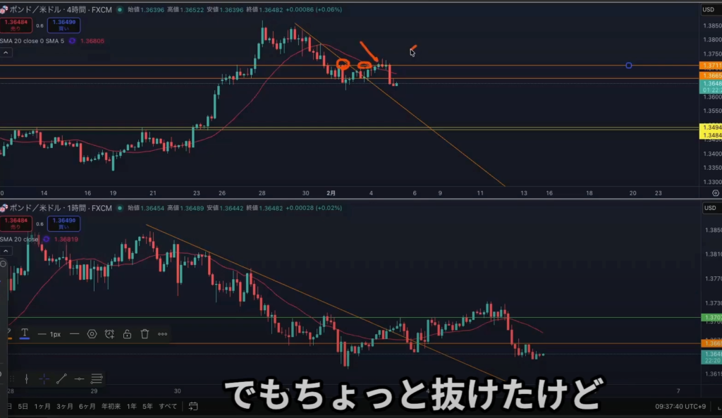 塾長は抜けてはいるがその後の動きを見て抜けているけど抜けていない判定としている、そうなると売り抑え勢力が居る事になるのでレジスタンスラインはそのまま動かさずにしておくどこで止まっているかどこを見られているかを考える