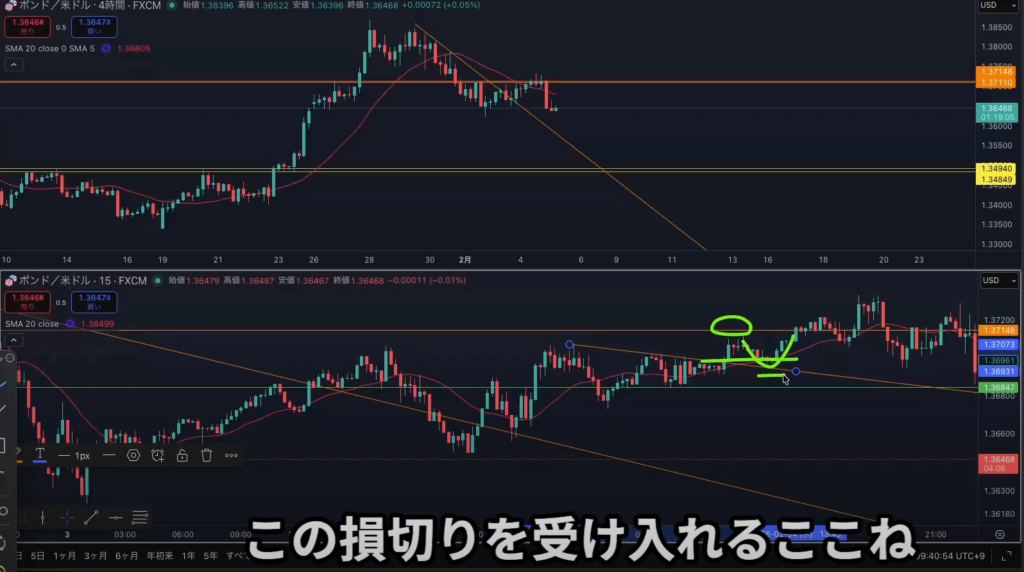 1h押し目買い15m攻防ライン抜けなどでエントリーした場合斜め抜けは売り抑えてくる勢力によって戻されて建値付近まで押してくる可能性があるのを頭に入れておく売り抑えてくる勢力が強ければそのまま損切に合う可能性もある