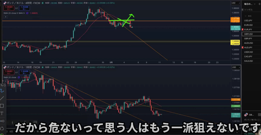 4hの1波を狙う場合4hMAは必ず抵抗になってくのでリスクとしてやめておくのもアリ、ただ1波なのでMAがリスクになるのは当たり前で抜けていくかを試すトレードになる
