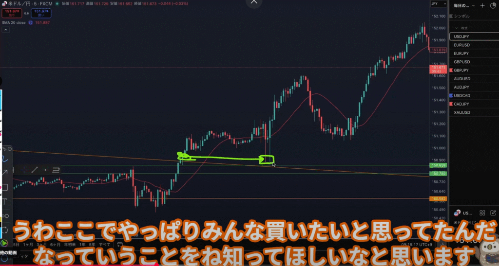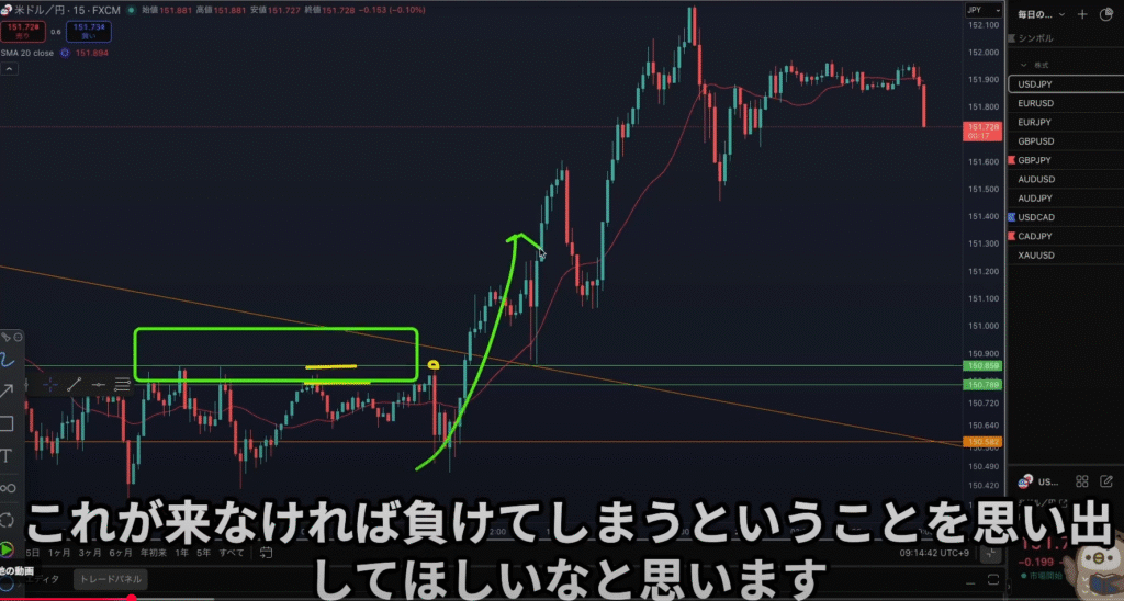 市場参加者がどう考えているのかをローソク足の動きなどから、感じ取れる様にならないといけないのでエントリーの有無は関係なく、感じ取れる様に常に意識しておく。