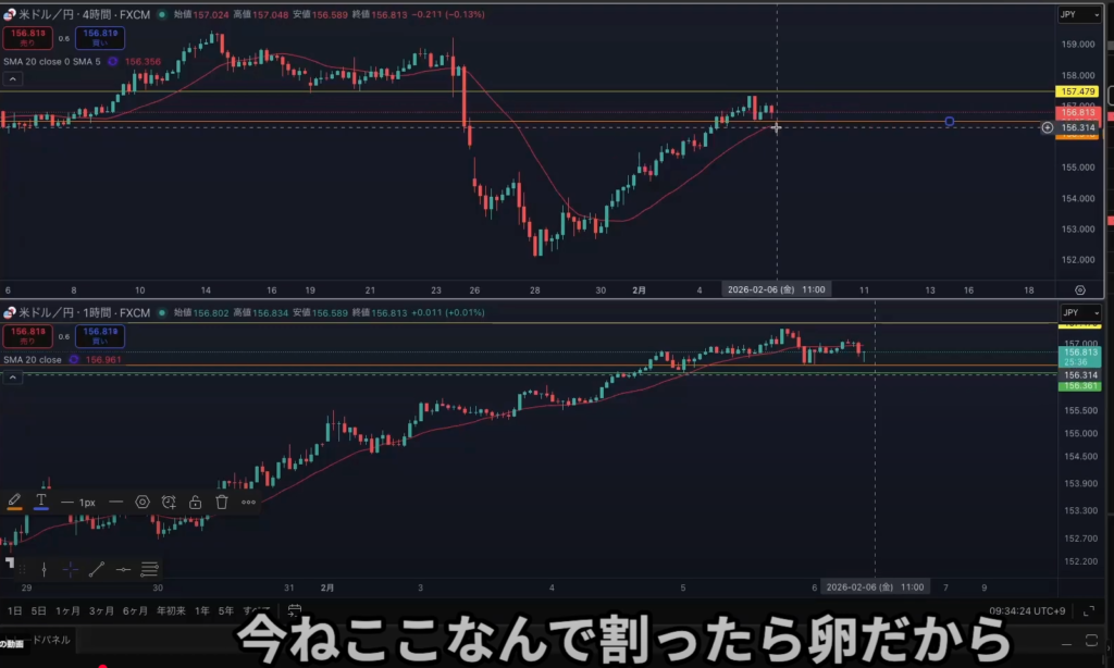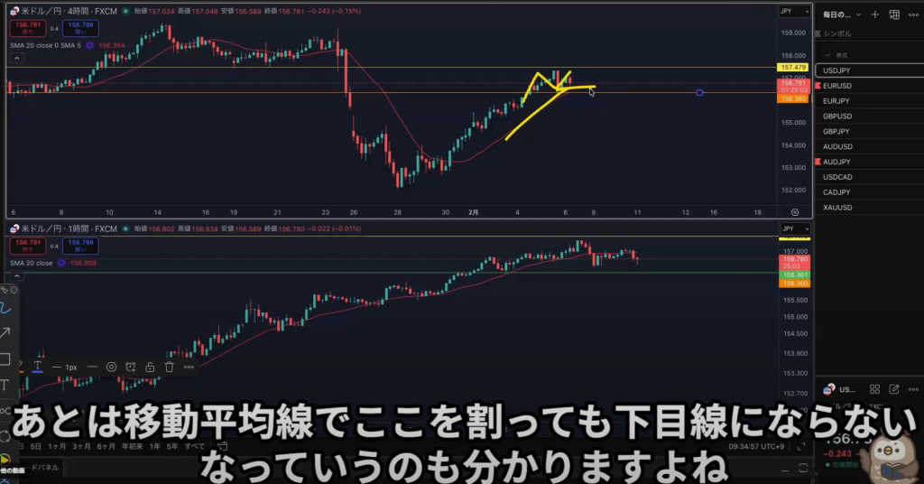 4h上昇の調整のヨコヨコが続いたMAに支えられて安値は抜けなかった、週足から1hまでのMAが全て支えて来ている状態と日足のレジスタンスラインに挟まれる形でのゴチャゴチャだと思う