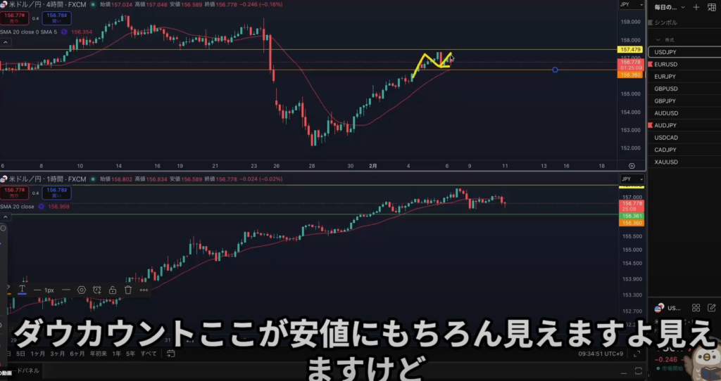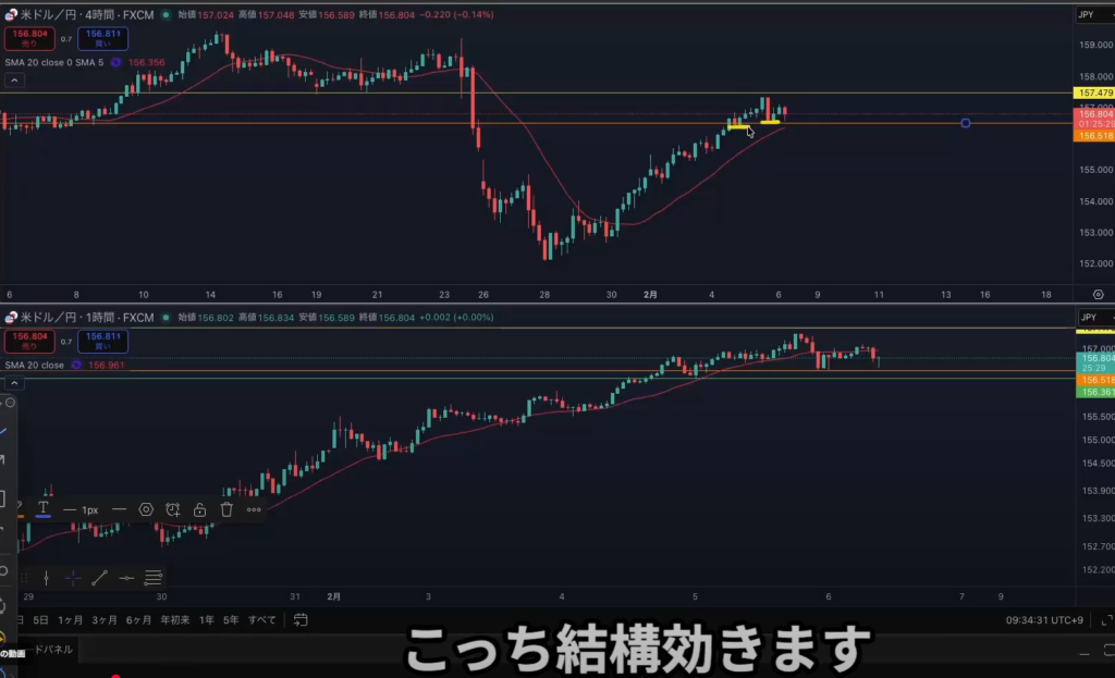 週足サポートラインと日足のレジスタンスラインが近く挟まれている状態なので上位足レベルではゴチャゴチャする可能性があるとしていたが値幅的にはあるので下位足にはそれほど影響はない可能性がある