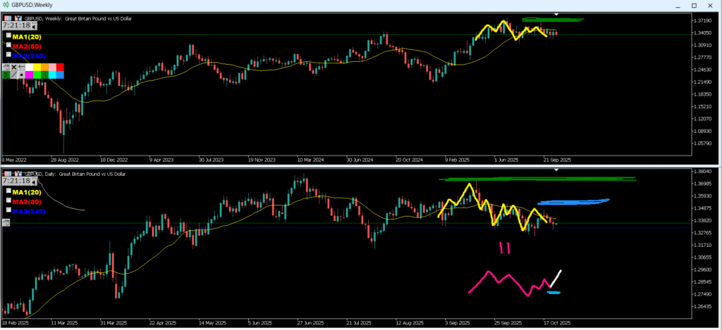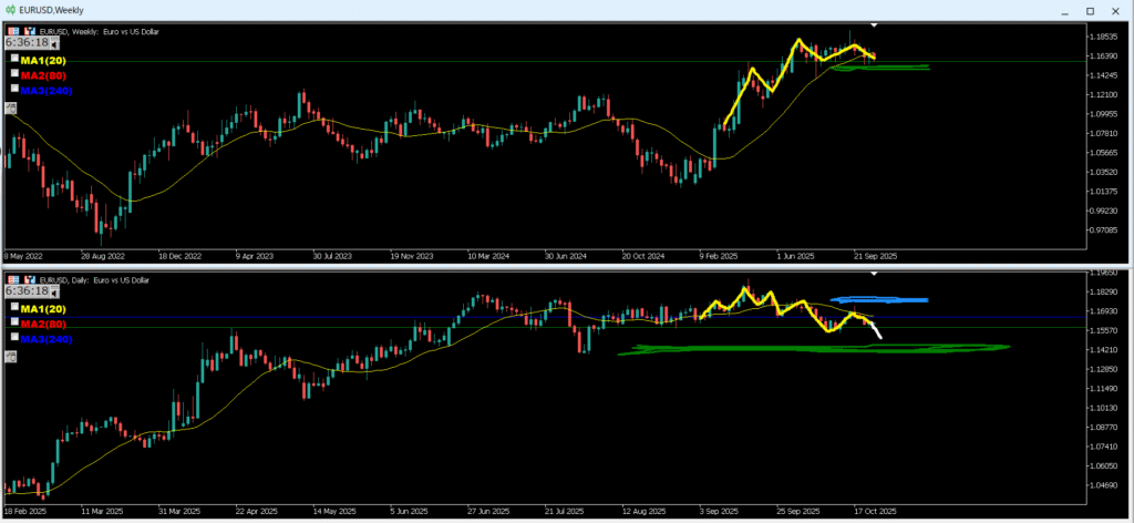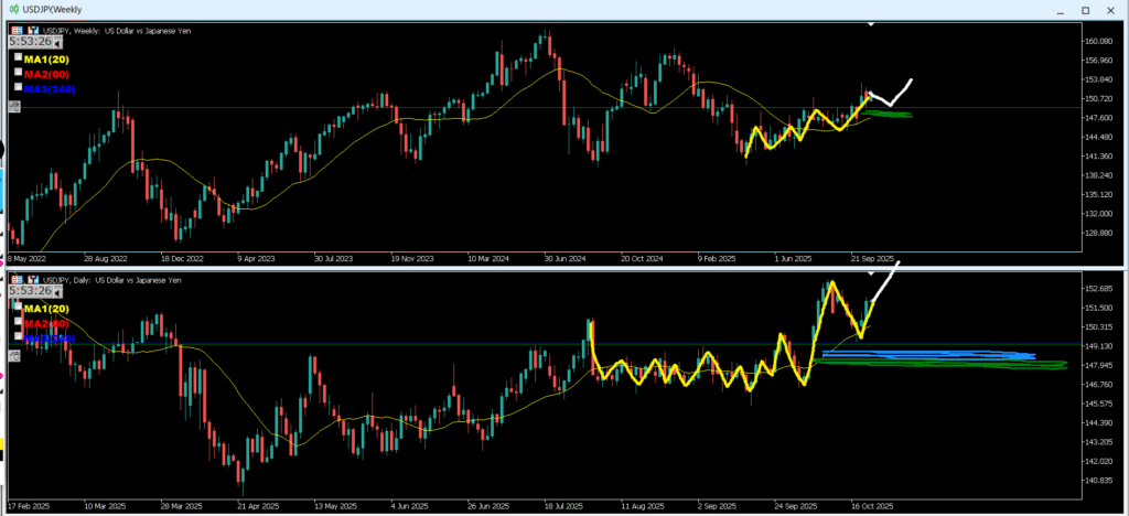 ・緑のラインへ来ると止められやすく押し目買いになりやすい、その際にMAに買い支えられる可能性がある。