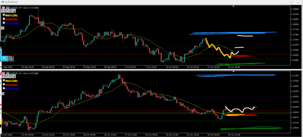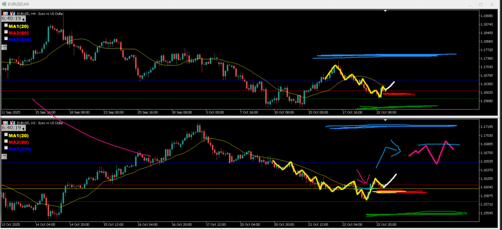 ・1h上昇に対する決済の下落と上位足達の上への買いがぶつかってこのヨコヨコになっていると判断