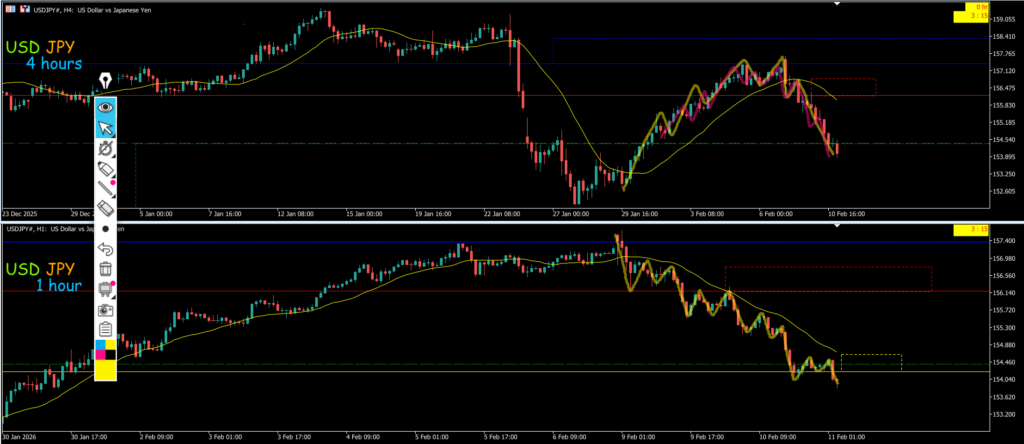 週足が下目線になる可能性があるぐらい大きく下降している、4hは下降し続けており水平線に戻してきても波的におかしくなる為明確な高安が出来るまで時間経過を待つ