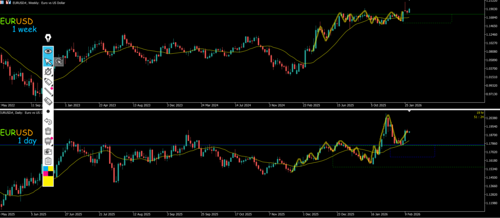 ・黄色の□に押し目買い・戻り売り・買い支え・売り抑え勢力