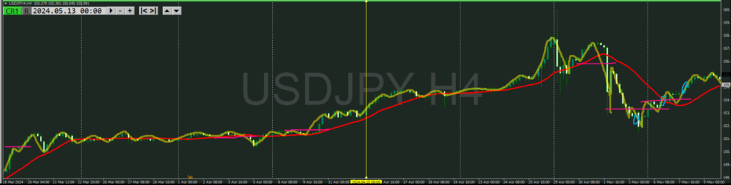 緑が週足 青が日足 赤が4h 黄色が1h