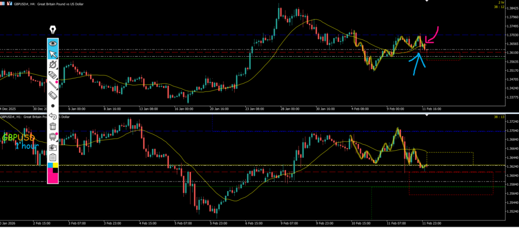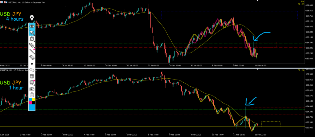 4h水平線で1h綺麗な二番1hMAに抑えられ1h下のままなので攻防ライン抜けでエントリー