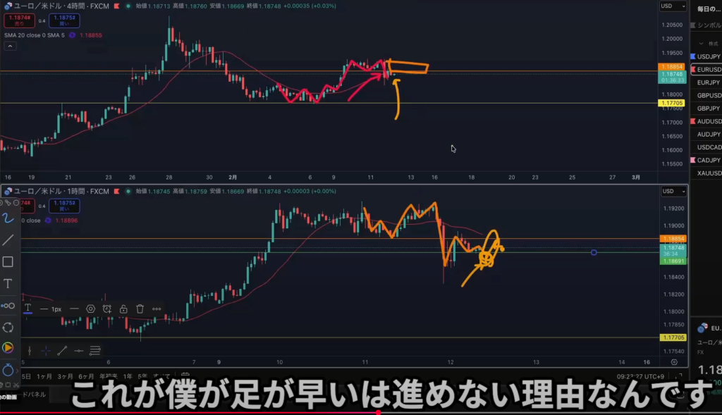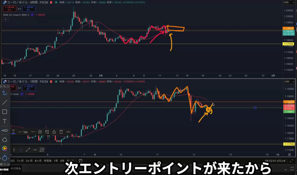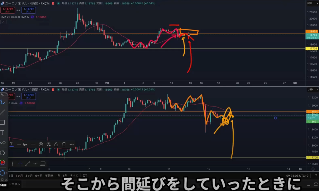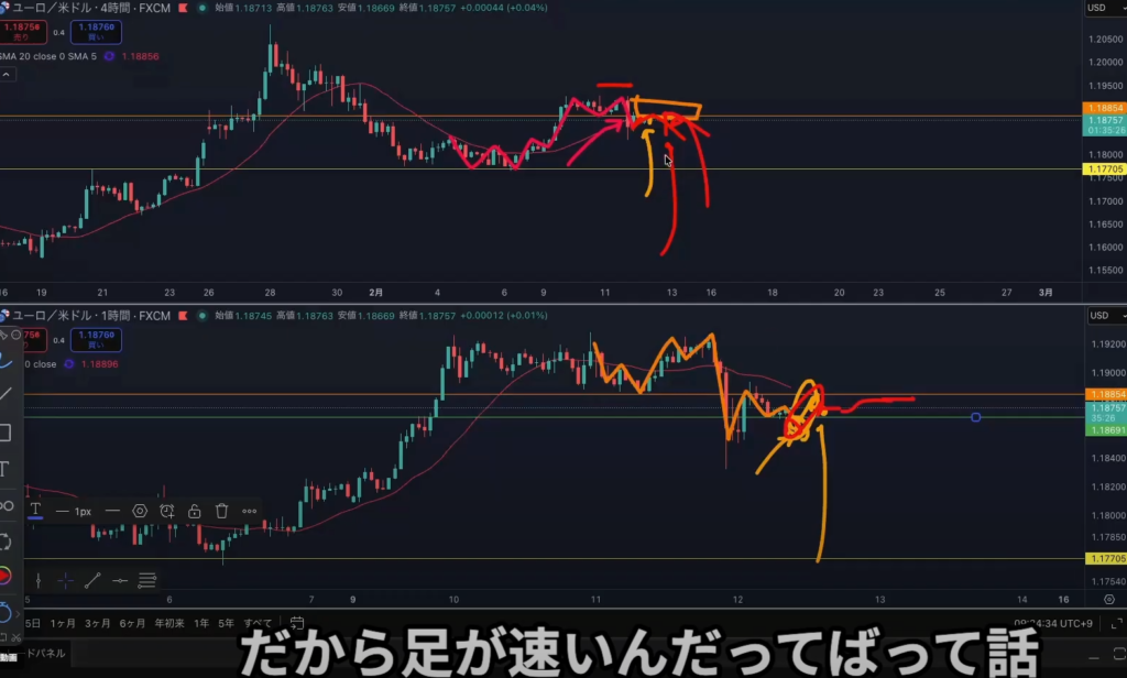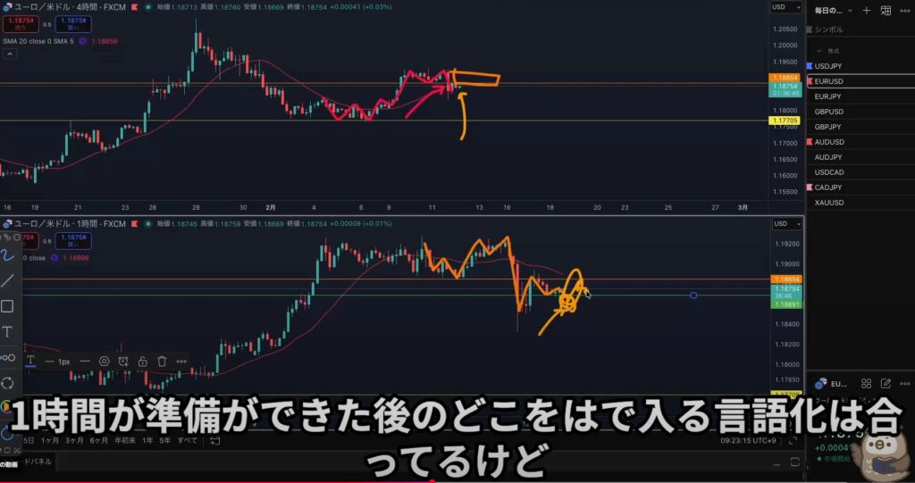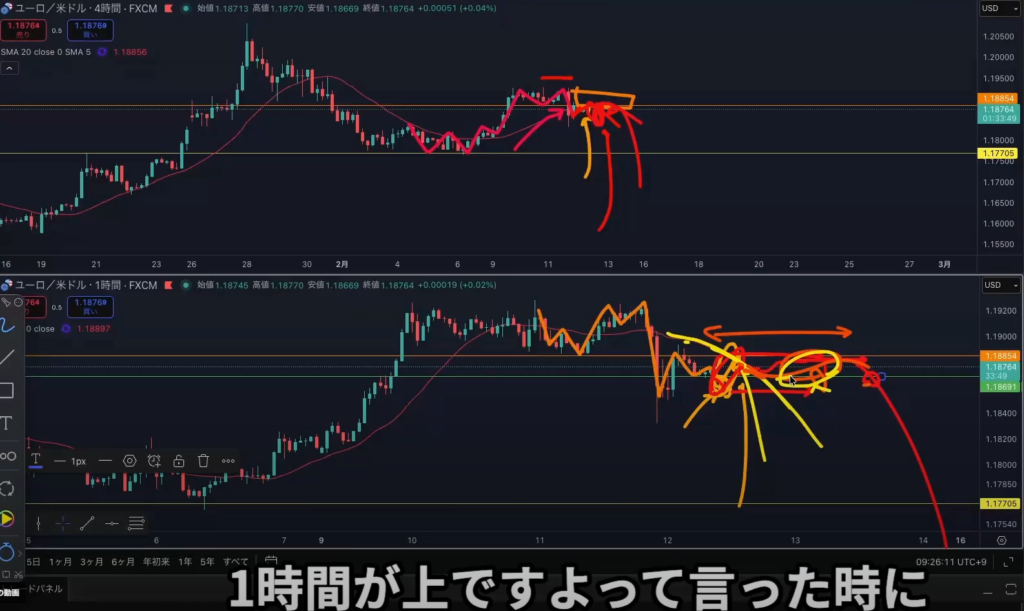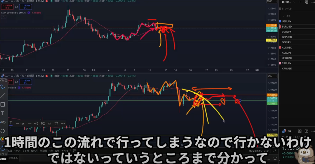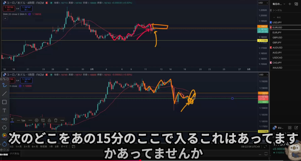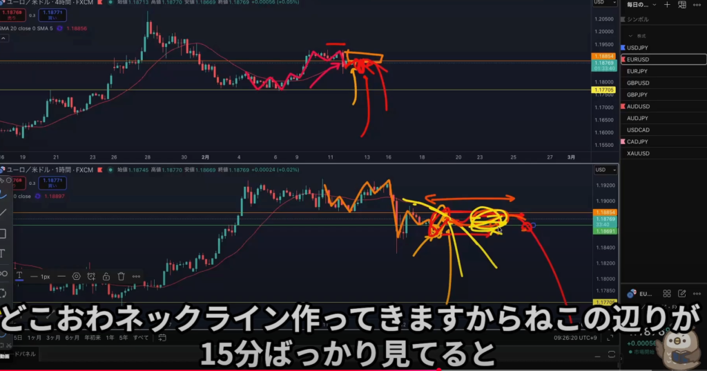 4h押し目買い戻り売りの際に1hが準備出来てネックラインを抜けて戻って来た場合は15mどこで終わるのでエントリーを考えるが、いつでも15mどこで終わるのでエントリーをすればいい訳ではない、軸足の4hの波が早い場合は15mどこで終わるのでエントリーしても戻される事がある