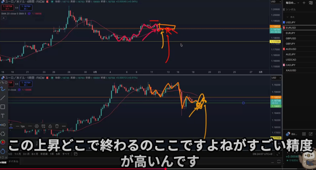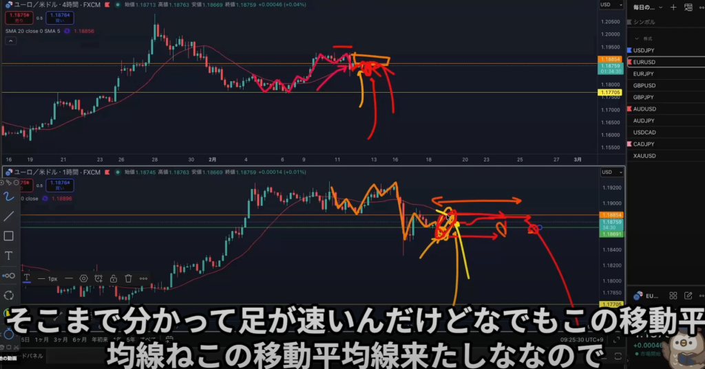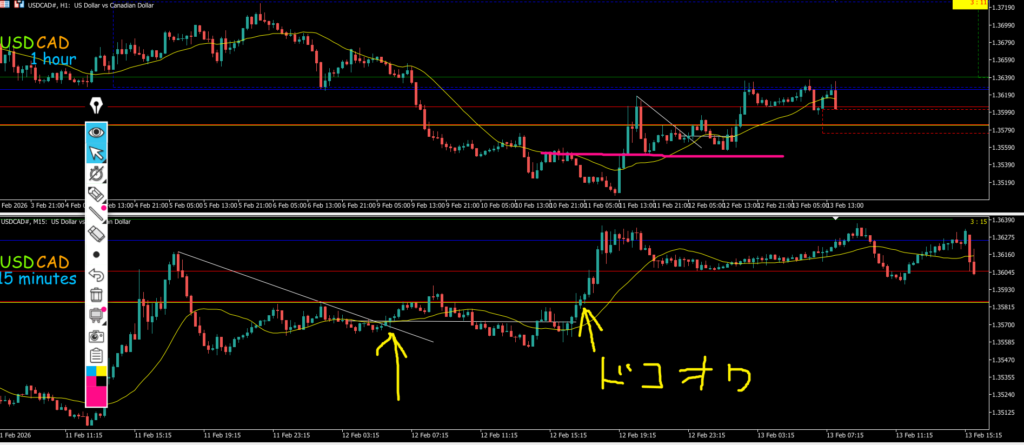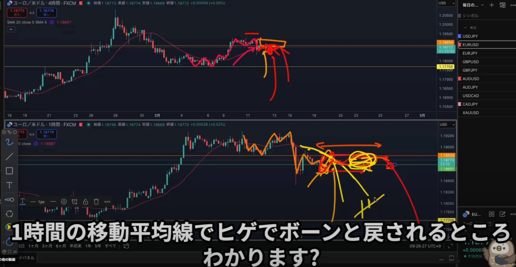 また4hしっかりした波と間延びした波が良くてそれまでに15mどこで終わるのでエントリーしても1hMAが上向きな場合などは1hMAによってヒゲで戻されるので、その辺を意識しておいて15mどこで終わるののエントリーを決める