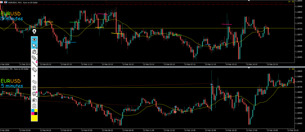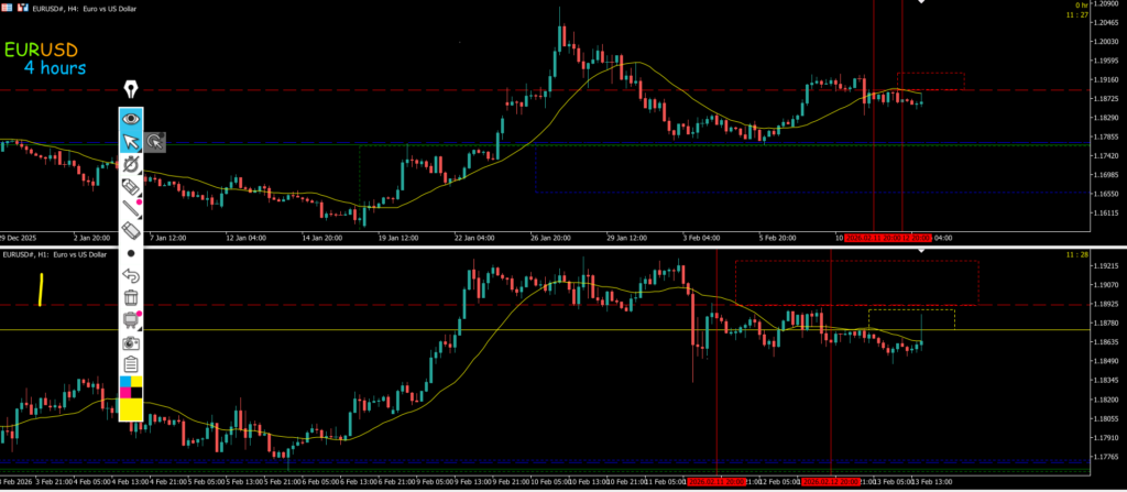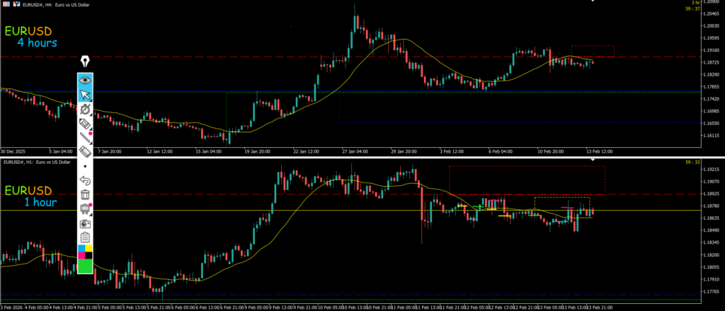 ・黄色の□に押し目買い・戻り売り・買い支え・売り抑え勢力