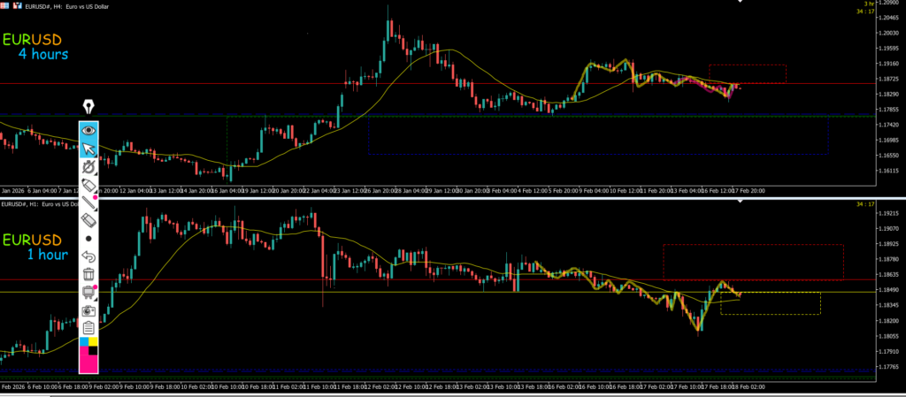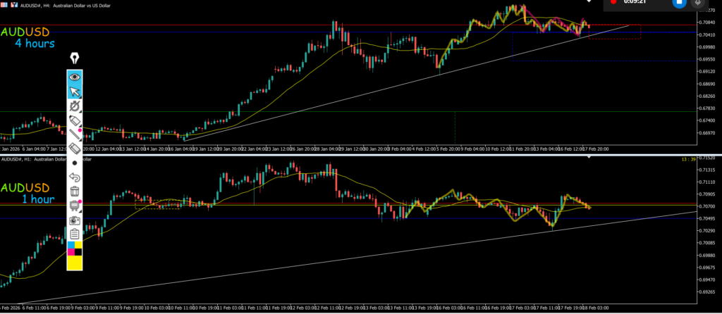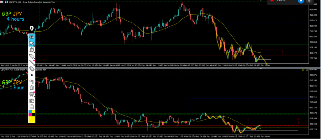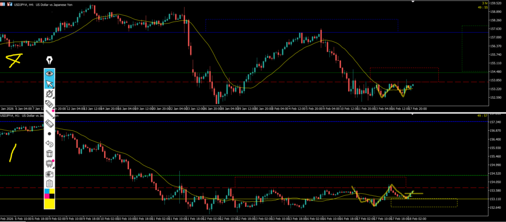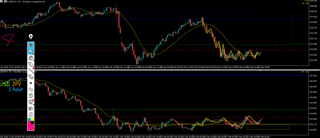 4h下降の調整のヨコヨコになっているので明確な高安抜けまで時間経過を待ちたい、ただ4hがレジスタンスラインを越えてTTSが出て1h押し目買いになったら4h1波を狙うエントリーを考えていきたい