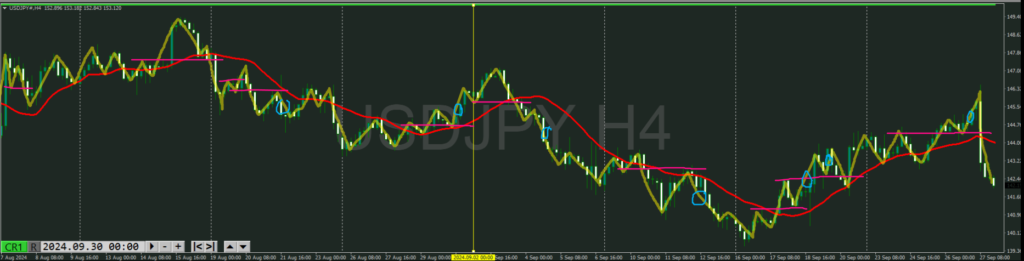 ・点線を抜けると上目線でトレンド転換シグナルになる