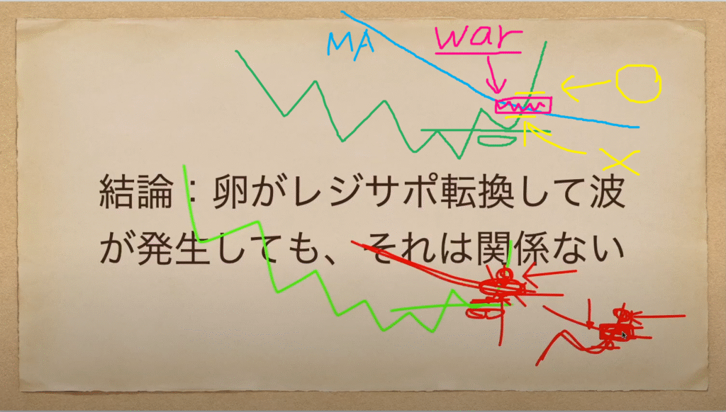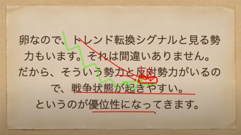 ダウ的にトレンド転換をしても移動平均線が抑えてくるので戦争状態が起きやすい、なのでトレンド転換シグナルになったローソク足をトレンド転換シグナルの卵と言う!