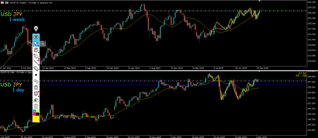 4h1hMAなども支えていて押し目買いの可能性もあるので全体的には上だとは思うが、4hMAがヨワンビルになり始めているようにも見え週足のレジスタンスラインもあるので4hが明確になるまで時間経過を待ちたい
