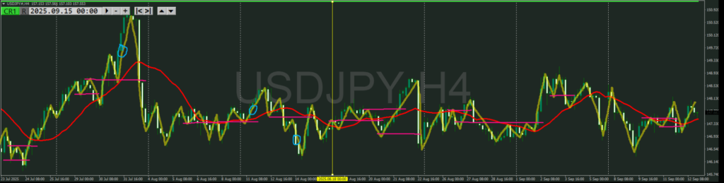 ・水平線へ来ると止められやすく戻り売りになりやすいが波的におかしくなる