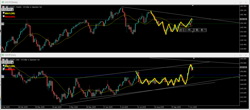 方向は上で押しが入って上昇したが実体では前回高値を越えれず、高値切り下げの二番天井になりそこから一気に下落して全戻しの状態、目立つ陰線が出来てきているのでこのまま下落した場合週足のトレンド転換シグナルになる可能性がある。