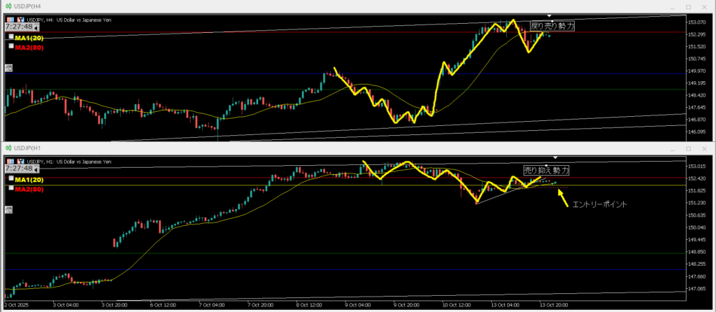 方向は下でヨコヨコ状態MAを抜けてエントリーポイントに来たらエントリーする所ではあるが上位足の状態を考えるとかなり慎重になる場面だと思う。
