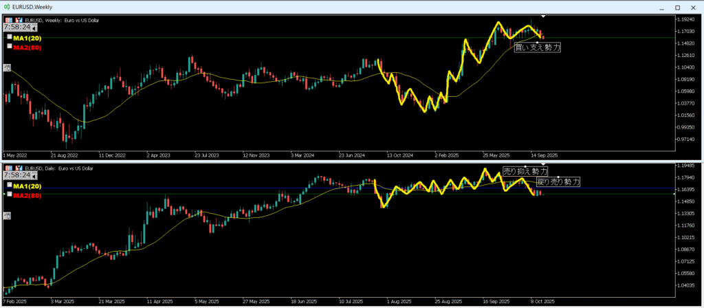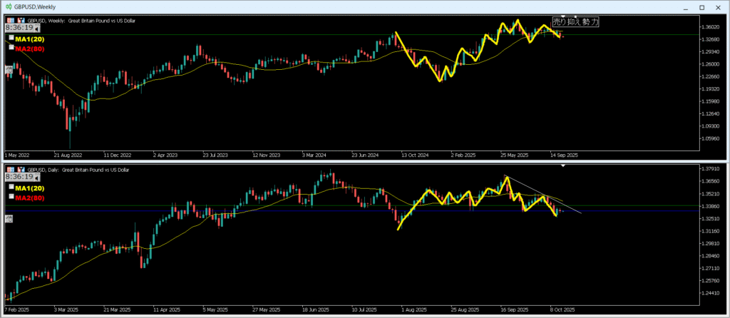 日足で見える三尊抜けからチャネルの下限とトレンドラインも抜けてきていて、MAがグランビルしており売り抑えられている。