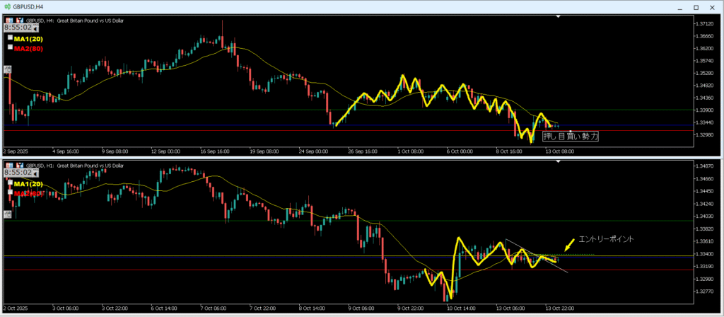 4h前回安値で綺麗に止められているので1h前回安値のヒゲ抜けでMAを抜けていれば波感的には良いのでエントリーしたいところ。