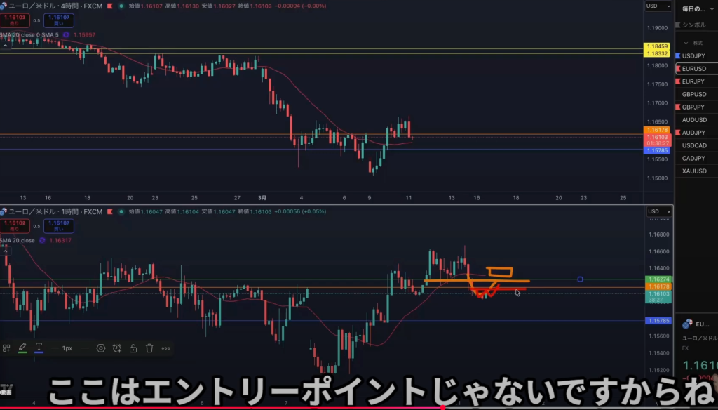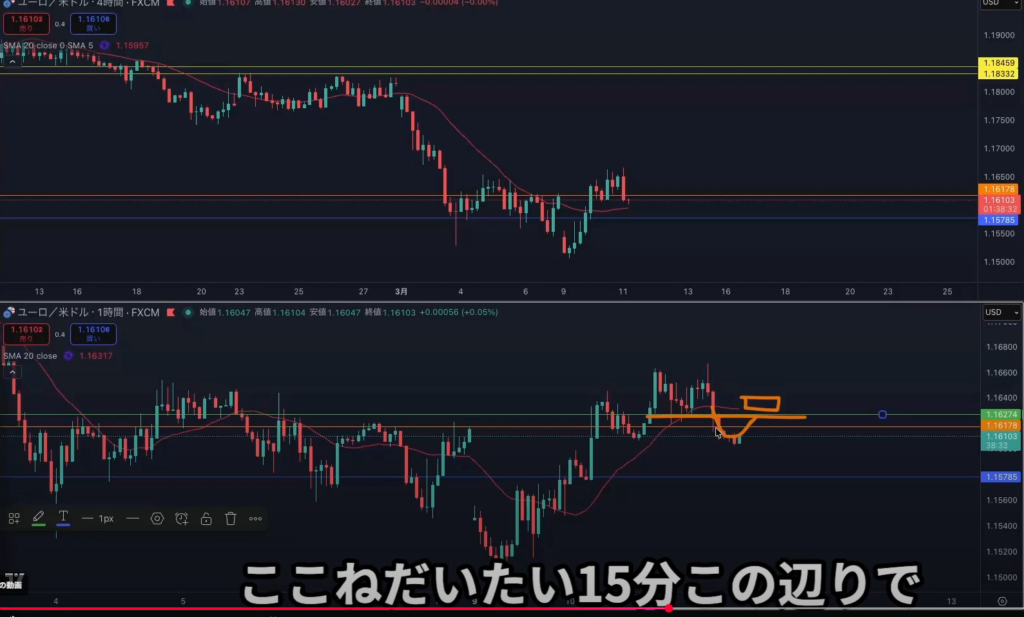 1hの戻り売り勢力がいる水平線で15m戻り売り否定でのエントリーは可能だが