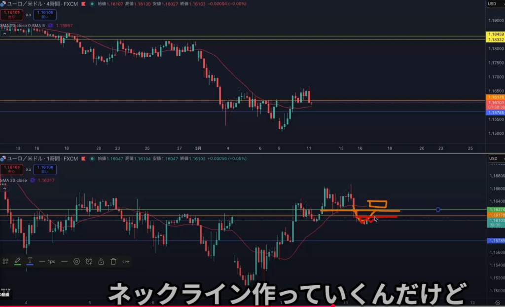 水平線より少し下でズレた位置に15mネックライン作って抜けてきてもそれはエントリーポイントではない