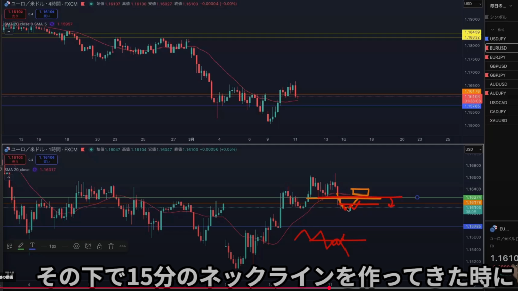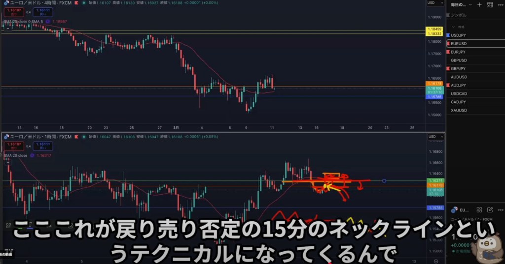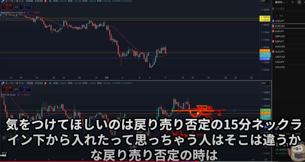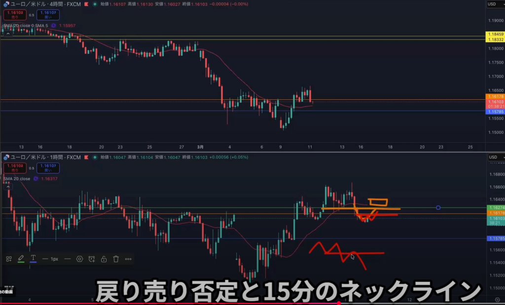 ・戻り売り否定は15分足のネックラインと同一水平線で使う。