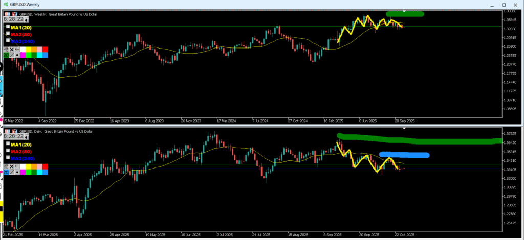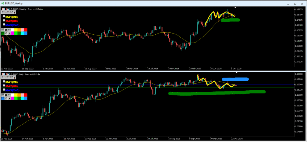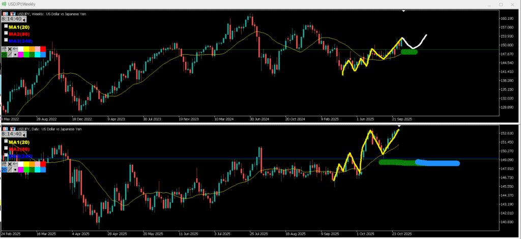 ・緑のラインへ来ると止められやすく押し目買いになりやすい、その際にMAに買い支えられる可能性がある。