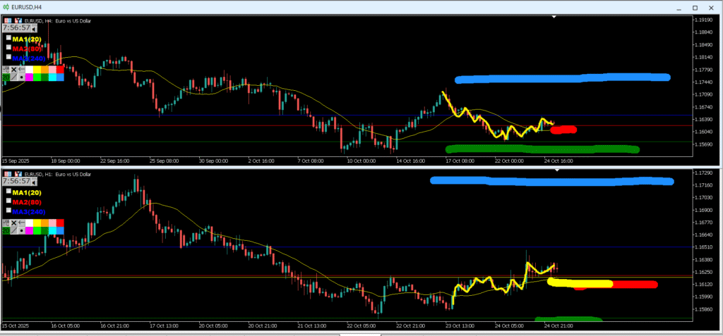 今日のユーロドルの押し目買いで1hトレンド転換のポイントも前回の4hの波と合っていたので入っても良い様なポイントだと思ったが入っていたら一旦少し上昇してから建値か損切にあっていた、その後かなり戻されたが4h買い支えの水平線で止まりそうだったので入るとすればこの下降が15mで終わったポイントだと思ったけど今は取引していないのと、何より日足の売り抑え勢力とトレンド転換シグナルの水平線が近くにあったのでエントリーは見送ると環境認識ではしていた。