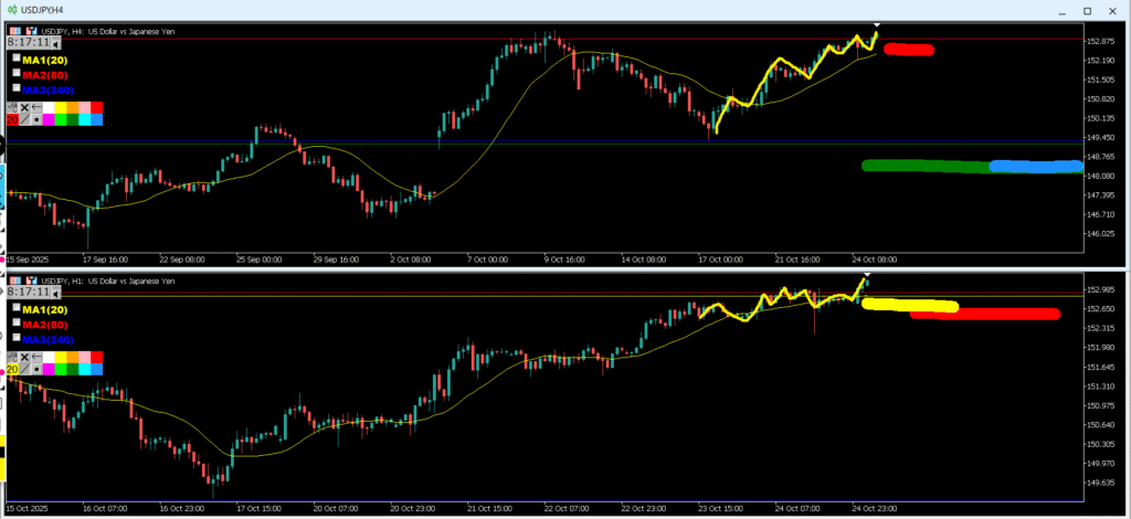 ・赤ラインへ来ると止められやすく押し目買いになりやすい、その際にMAに買い支えられる可能性がある。