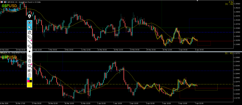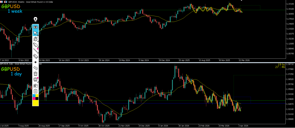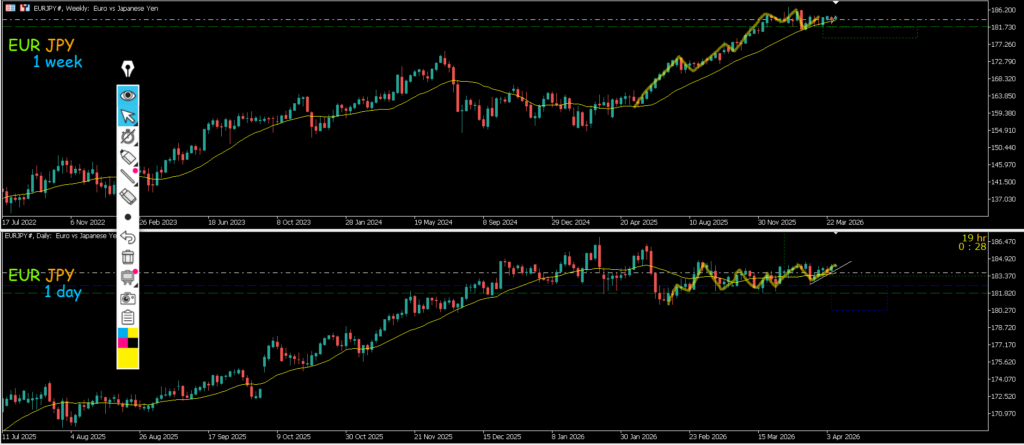 4h水平線で止まれば押し目買いを考えていきたいが1hMAが抑えてきているのでエントリーは抜けてからになる、また上昇した場合も週足日足のレジスタンスラインやMAがあるので大きな波は出ないように感じる